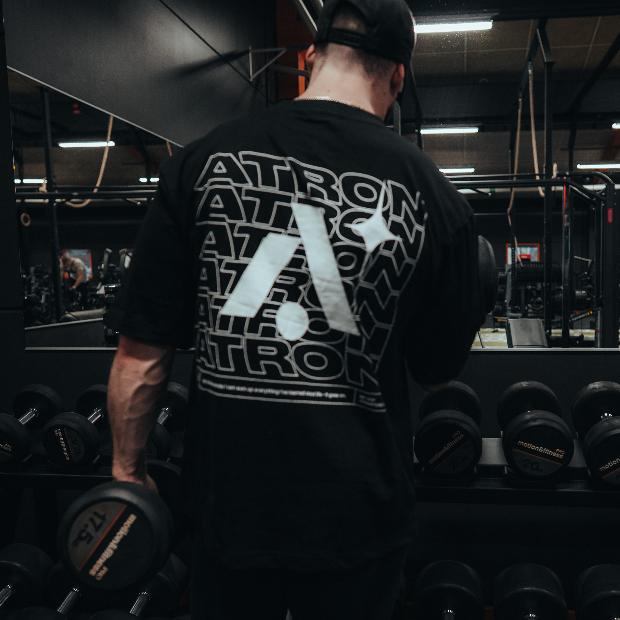 Minimalistisk och subtil ATRON-Logga fram på bröst och ett stort repeating-mönster med "ATRON" på ryggen. Rå, minimalistisk och direkt igenkännbar.